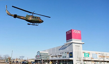 イオンモール釧路昭和店に救援物資を運ぶUH1Jヘリ(1月26日、釧路市のイオンモール釧路昭和店)=イオン提供