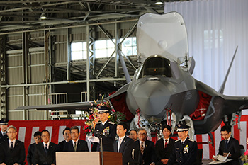 最初に式典の執行者を代表して航空総隊司令官の谷嶋正仁空将が登壇し、F35B戦闘機が空自にとってゲームチェンジャーとなる期待感を示した。そのためには艦上運用などの能力を最大限発揮することが求められるとして「米軍および海上自衛隊との緊密な連携が必要だ」と述べた。また「なにより日々の錬成では地元の理解が不可欠だ」と強調、スローランディングなどでの旋回を極力洋上で行うことや、訓練実施の地元への事前通知を確実に行うよう指示した・・・