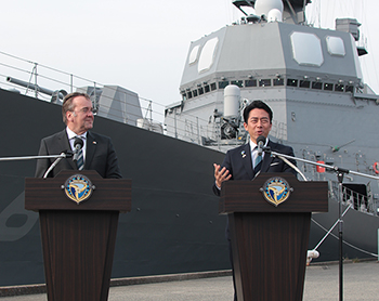 護衛艦「てるづき」の前で共同記者会見を開いた小泉大臣(右)とピストリウス国防相(3月22日、海自横須賀基地)