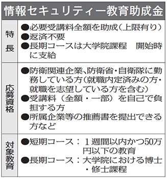 対象者はサプライヤーを含む防衛関連企業や防衛省・自衛隊の情報セキュリティー関連業務従事者(予定者を含む)で、学費・受講料などを自己負担する者に限る。
