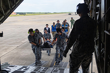模擬患者を航空自衛隊C130Hハーキュリーズに搬送(7月22日、三沢基地)