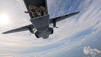 フランス空軍のCN235輸送機から各国共同の自由降下を行う空挺団員(8月26日、スマトラ島のバトゥラジャ演習場)=第1空挺団提供