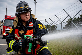 米陸軍車力通信所内で爆発火災の消火活動に当たるつがる市消防本部の隊員(米軍三沢基地提供)