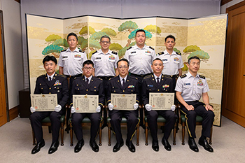 約1カ月間の任務を終え、帰国した4人が第3級賞詞を受章した(8月25日、防衛省)=陸自提供