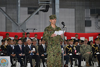 駐屯地の開設記念式典で訓示する青山司令(9月7日、佐賀駐屯地)=佐賀駐屯地司令業務室提供