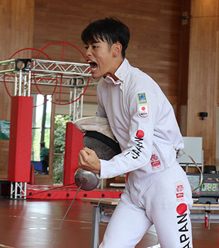 苦手のフェンシングで勝利し、雄叫びを上げる冨田1士(9月28日、千葉県長柄町のリソルの森)