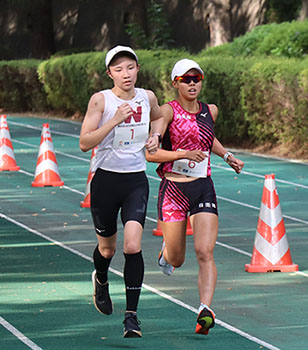 レーザーランの最終5周目で激しいデッドヒートを繰り広げる早実中の内山選手(左)と矢野士長