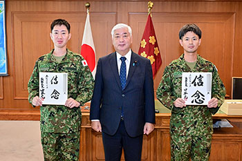 中谷前大臣(中央)への出国報告で記念撮影する梅井1尉(左)と室田2曹(10月17日、防衛省)=防衛省提供