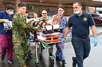 パラオの救急隊員(手前右)らと共に患者を搬送する陸自隊員(同左)と海自隊員(右から2人目)(9月23日、パラオ国際空港)