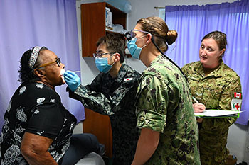 カナダの隊員(右端)らと共に地元住民の歯科検診に当たる空自隊員(9月23日、パラオのコロール島)