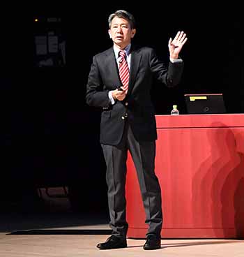 母校の生徒にエールを送る前陸幕長の森下泰臣氏(10月9日、久留米シティプラザ)