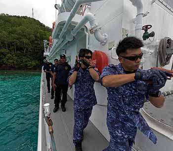模擬銃を手に立入検査訓練をする特警隊員たち(10月15日、パラオのコロール周辺海域)