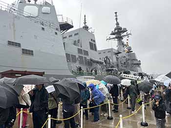 雨の中、傘をさした人々が護衛艦を見学しようと列をつくった(10月11日)