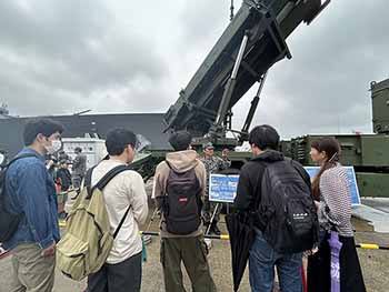 空自隊員がペトリオットミサイルについて説明。来場者は熱心に聞き入った(10月11日)