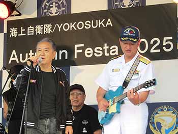 野外ステージで「ジョニー・B・グッド」を演奏する真殿総監(右)と上地市長(10月11日)