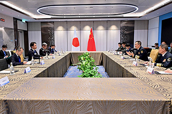 小泉防衛相(左手前から2人目)は日中防衛相会談で、活発化する中国の軍事活動について「強い懸念」を伝えた(11月1日、マレーシアの首都クアラルンプール市内)=防衛省提供