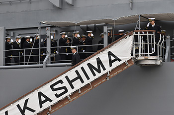 「かしま」から退艦する実習幹部たち(11月12日、横須賀基地)