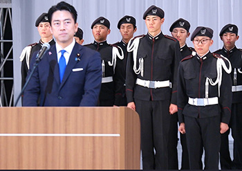 冒頭、地元横須賀の陸自高工校のドリル部を前にあいさつする小泉氏(いずれも11月14日、東京都千代田区の日本武道館)