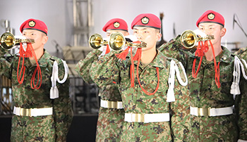 選抜された精鋭の第1師団らっぱ隊が力強く演奏した