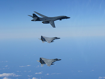 共同訓練を行う米空軍B1B戦略爆撃機(上)と空自F15戦闘機(11月15日)=統幕提供