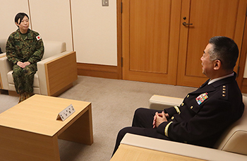 女性初で、看護官としても初めての派遣となるUNFMACの教官養成訓練に中原1尉(左)が選ばれ、荒井陸幕長に出国を報告(11月12日、防衛省)