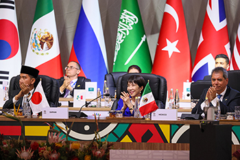 高市早苗首相は11月22日から23日まで、南アフリカ・ヨハネスブルグで開催された20カ国・地域首脳会議(G20サミット)に出席した。議長国である南アフリカのラマポーザ大統領が、気候変動や低所得国の債務問題への対応強化が盛り込まれた首脳宣言を発表。首相は滞在期間中にインドのモディ首相、ドイツのメルツ首相らと精力的に会談し、「自由で開かれたインド太平洋の実現(FOIP)」に向け、安全保障政策などの分野で協力を一層強化していくことで一致した。(船木正尋)