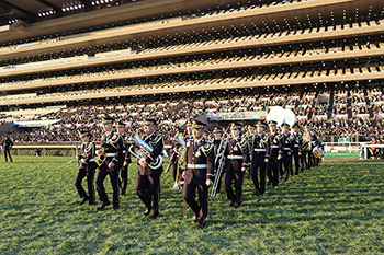 JRA(日本中央競馬会)主催のGⅠレース「第45回ジャパンカップ」が11月30日、東京都府中市の東京競馬場で行われた。毎年、同レースの「ファンファーレ演奏」と「昼の演奏会」を担当する陸上自衛隊中央音楽隊から小林崇浩3陸佐以下45人が参加した。今回は会場のボルテージが最高潮に高まるファンファーレ直前から、メインレース終了後までの隊員たちに密着した。(寉見陽平)