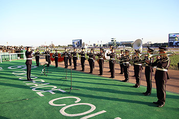 ジャパンカップが終わり、興奮冷めやらぬ会場の中、表彰式での演奏のため芝コースに入る陸自中音隊員(いずれも11月30日、府中市の東京競馬場)