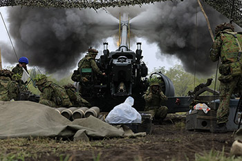 西部方面特科連隊(北熊本)第4大隊による155ミリ榴弾砲「FH70」の実弾射撃(9月24日、北海道の矢臼別演習場)=久留米駐屯地広報班提供