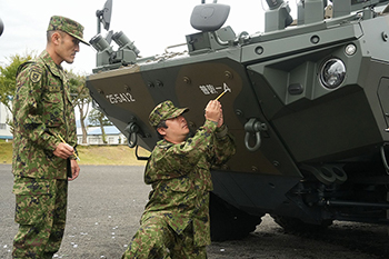 「普教―4」と筆入れする林4中隊長(右)と藤崎1曹(11月5日)