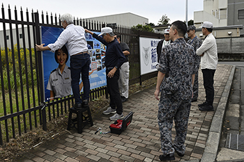 【入間つばさ会】空自OB組織の入間つばさ会は11月1日、入間基地稲荷山門前に募集看板を設置した。航空祭を2日後に控えた同日午前、同会から武藤茂樹会長、早坂正事務局長、畑中富雄理事が出席。中警団からは久保田康夫2佐(現管理部長)、人事班長らが立ち会い、設置作業を見届け完成を喜び合った。