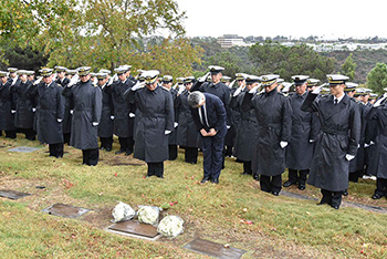 故マーシャル・F・トンプソン大佐の墓前に献花し、敬礼する練習艦隊司令官の渡邉浩将補(中央左)以下、実習幹部たち(10月14日、米サンディエゴのエル・カミノ・メモリアル墓地)