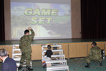 今回の行事で初めて開かれたeスポーツ大会。決勝戦で勝利し、ガッツポーズする隊員(左)=いずれも12月12日、倶知安駐屯地