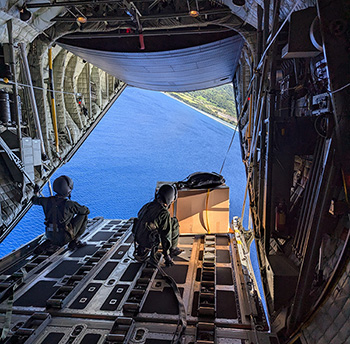 C130Hから眼下に望む島々に梱包した物資を投下(12月5日)