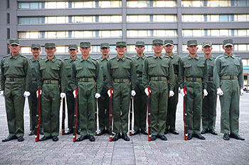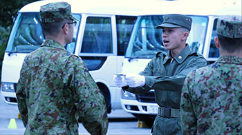 10月6日に行われた、銃を持たない状態での基本動作の試験(見極め)を無事に合格した新隊員たち=既報記事。