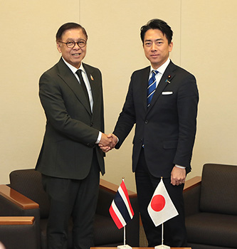 タイのシーハサック外相(左)と握手する小泉大臣。両者は中国機による自衛隊機へのレーダー照射について懸念を共有した(12月19日、国会内)