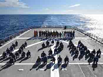 艦番号と同じ424回の発着艦達成を記念して人文字を作った「はまな」乗員=12月5日、沖縄西方海域