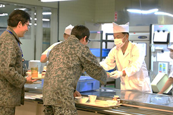 【小松】航空自衛隊小松基地で11月28日、6空団司令兼小松基地司令の野村信一将補が、基地業務群業務隊給食小隊を視察した。日頃から隊員に栄養価の高い食事を提供している給食小隊員への感謝と労をねぎらう目的で、自ら調理や配膳に加わった。
