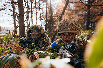 偽装した4普連の隊員(左)と英陸軍の隊員が共同で敵陣地近くに潜入、偵察し、情報を収集(11月6、7日)=4普連提供