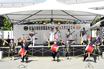 「那覇基地サマーフェスタ」で、エイサー部とコラボ演奏する今村曹長(ステージ右端)ら軽音楽部員