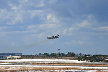 当日は曇り空から、次第に雪やあられが降るあいにくの天候となったが、F15戦闘機が午前11時15分に先陣を切って離陸。続いてT4練習機が飛び立った。午後1時には、昨年4月に配備された新鋭のF35A戦闘機が離陸し、・・・