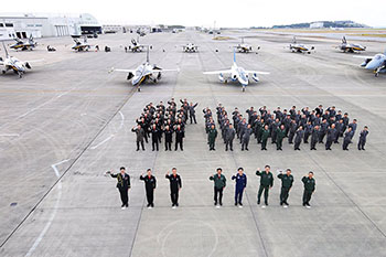 日韓両国の隊員が記念撮影するなど部隊間で交流した(1月28日、空自那覇基地)=防衛省提供