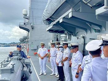 「ゆうだち」を視察するブルネイ軍の士官たち(2月6日、同ムアラ)=ブルネイ海軍提供