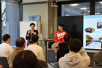 「国を背負う気持ち」について対談を行う坂井選手(右)と行政官の持増氏(左)