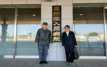 入間病院を訪れた半田さんと記念写真に納まる川上1尉(1月17日)