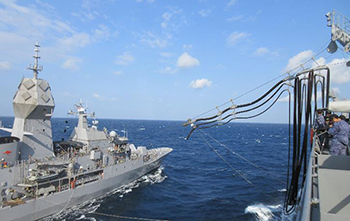 「とわだ」から「トゥーンバ」にホースを繋いで給油した(2月22日、東シナ海)=海自提供