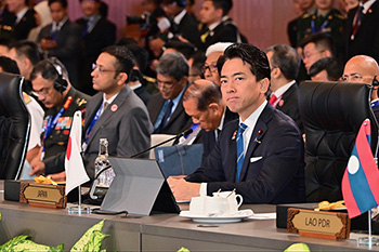 防衛相就任から約1週間後にADMMプラスに出席した小泉氏(11月1日、マレーシアの首都クアラルンプール市内)=防衛省提供